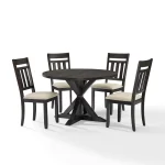 Sure to be the focal point of your modern farmhouse decor, the Hayden 5pc Round Dining Set brings rustic style to family gatherings. The large round table top can comfortably accommodate four diners for a casual family meal. With intersecting legs, the table’s pedestal base complements the classic slat back design of the dining chairs. Beautifully crafted, the Hayden 5pc Round Dining Set is a timeless centerpiece for your dining room.